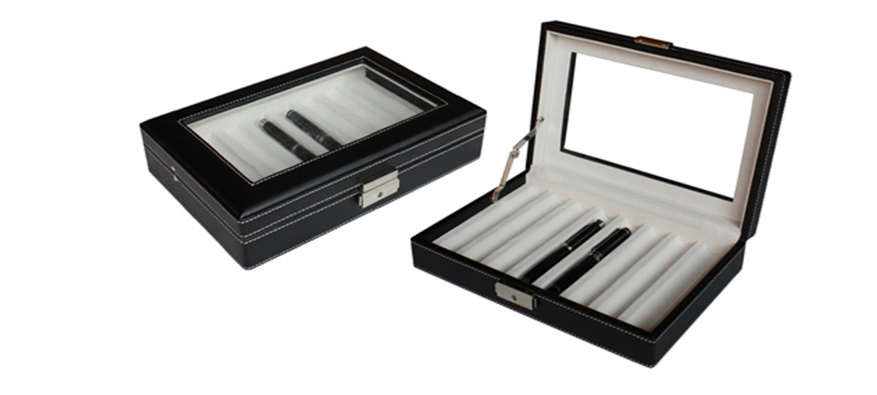 Coffret boite de rangement noire 8 stylos haut de gamme et fermoir sécurisé, avec coutures blanches.